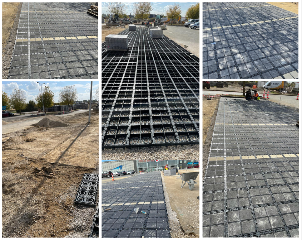 Pose dalle en plastique et remplissage en pavés 1414 autobloquant